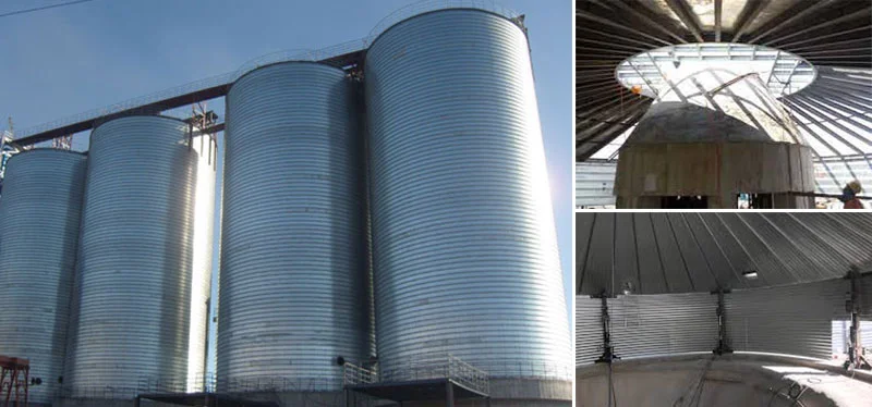 Конструктивно силос состоит из следующих основных частей — верхней крыши (обычно конической или сферической формы), цилиндрического корпуса, днища (конического или плоского), опорной рамы и фундамента. Дополнительное оснащение включает: