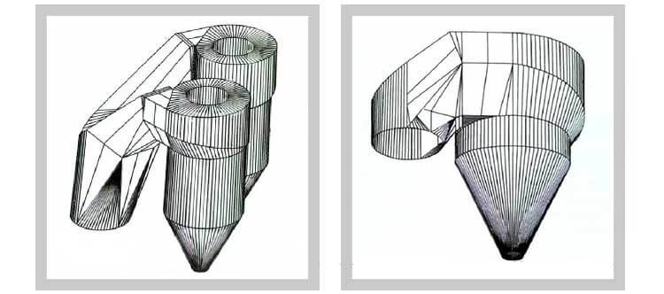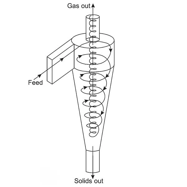 - Поток газа с взвешенным материалом тангенциально поступает в циклон текущей ступени. Здесь происходит разделение — очищенный и частично охлажденный газ направляется вверх на следующую ступень, а материал через нижний мигалковый клапан пересыпается в более горячий стояк следующего уровня.