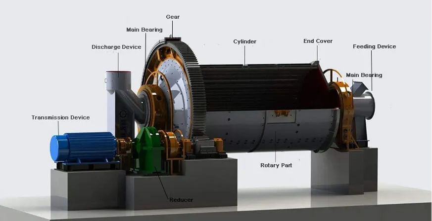 Угольная мельница — это горизонтальный барабанный аппарат непрерывного действия, в котором одновременно происходят процессы сушки, измельчения и транспортировки материала за счет комбинированного воздействия горячего воздуха и мелющих тел. Конструктивно оборудование включает такие узлы и системы: