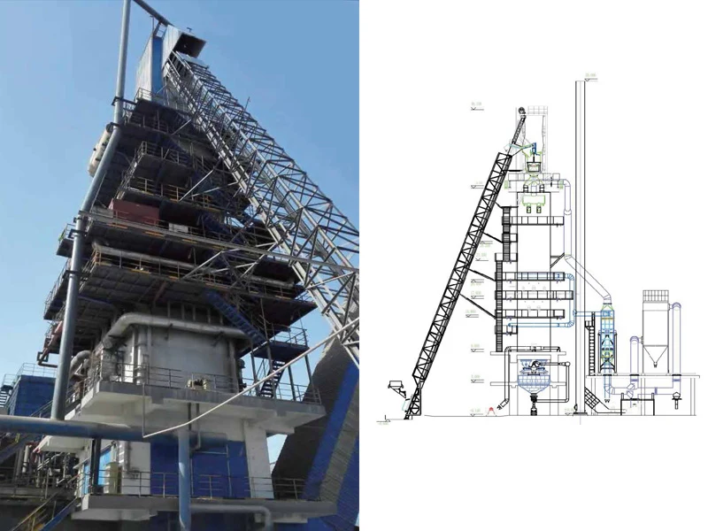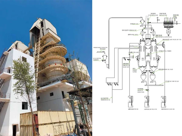 Очистка отходящих газов осуществляется в два этапа. Сначала дымовые газы проходят через импульсный рукавный фильтр FSD с автоматической регенерацией рукавов сжатым воздухом. Затем поток направляется в десульфуризационную башню из стеклопластика, где происходит мокрое или полусухое улавливание сернистого ангидрида и оксидов азота. Концентрация твердых частиц на выходе из трубы стабильно удерживается ниже 10 мг/нм³. Этот показатель соответствует самым жестким экологическим нормам. Планировка производственной линии тщательно продумана. Одна печь вместе с системами подачи, распределения, выгрузки, охлаждения и силосами хранения занимает площадь примерно 40×40 м.